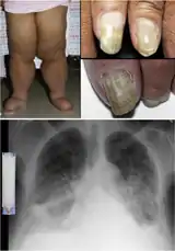 Yellow nail syndrome, also known as "primary lymphedema associated with yellow nails and pleural effusion",[1]:849 is a very rare medical syndrome that includes pleural effusions, lymphedema (due to under development of the lymphatic vessels) and yellow dystrophic nails.[2] Approximately 40% will also have bronchiectasis. It is also associated with chronic sinusitis and persistent coughing. It usually affects adults.[3][4]:665[5]