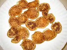 Zebra chip, also known as papa manchada and papa rayada, is a disease in potatoes putatively caused by an alphaproteobacteria "Candidatus Liberibacter solanacearum", which is vectored by the potato psyllid.[2][3] When fried, potato tubers from infected plants develop unsightly black lines resembling the stripes of zebras that render the chips unsellable.[4] Additionally, striped sections of chips frequently burn and caramelize, resulting in a bitter flavor. No health risks have been connected with consumption of infected potato chips.[4]