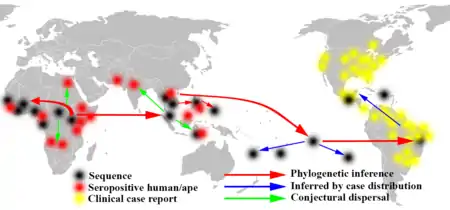 The Zika virus is first isolated in 1947 in a rhesus monkey in the Zika Forest near Entebbe, Uganda, and first recovered from an Aedes africanus mosquito in 1948.[4][5] Serological evidence indicates additional human exposure and/or presence in some mosquito species between 1951 and 1981 in parts of Africa (Uganda and Tanzania having the first detection of antibody in humans, in 1952,[6] followed by isolation of the virus from a young girl in Nigeria in 1954 during an outbreak of jaundice,[7] and experimental infection in a human volunteer in 1956.[8] The virus was then found variously in Egypt, Central African Republic, Côte d'Ivoire, Senegal, Sierra Leone, and Gabon; Between 1969 and 1983, Zika was found in equatorial Asia including India, Indonesia, Malaysia and Pakistan.[9] Zika is generally found in mosquitoes and monkeys in a band of countries stretching across equatorial Africa)[10] and Asia (Malaysia, Philippines, Thailand, Vietnam, and Indonesia).[11][12][13] The first confirmed case of Zika fever in a human occurs in Uganda during 1964 in a field researcher, who experiences a mild, non-itchy rash.[4]