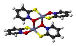 The pyrithione ligands, which are formally monoanions, are chelated to Zn2+ via oxygen and sulfur centers. In the crystalline state, zinc pyrithione exists as a centrosymmetric dimer (see figure), where each zinc is bonded to two sulfur and three oxygen centers.[3] In solution, however, the dimers dissociate via scission of one Zn-O bond.