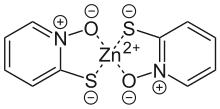 Zinc pyrithione (or pyrithione zinc) is a coordination complex of zinc. It has fungistatic (that is, it inhibits the division of fungal cells) and bacteriostatic (inhibits bacterial cell division) properties and is used in the treatment of seborrhoeic dermatitis.[2]
