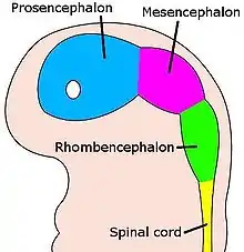 Main structures of the developing brain: the prosencephalon (forebrain) consists of the telencephalon and diencephalon, the mesencephalon is the midbrain, and the rhombencephalon is the hindbrain.
