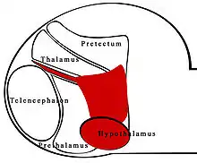 Forebrain structures in the fish at 3-4 days (with pretectum from midbrain for better depiction of boundaries), with shh expression in red; rostral extension between the prethalamus and thalamus depicts the ZLI.