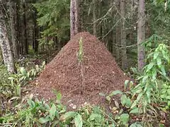 Wood ants (Formica paralugubris) often incorporate large quantities of solidified conifer resin into their nests. Laboratory studies have shown this resin inhibits the growth of bacteria and fungi in a context mimicking natural conditions.[46] The ants show a strong preference for resin over twigs and stones, which are building materials commonly available in their environment. There is seasonal variation in the foraging of ants: the preference for resin over twigs is more pronounced in spring than in summer, whereas in autumn the ants collect twigs and resin at equal rates. The relative collection rate of resin versus stones does not depend on infection with the entomopathogenic fungus Metarhizium anisopliae in laboratory conditions, indicating the resin collection is prophylactic rather than therapeutic.[47]