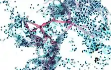 Zygomycosis is the broadest term to refer to infections caused by bread mold fungi of the zygomycota phylum. However, because zygomycota has been identified as polyphyletic, and is not included in modern fungal classification systems, the diseases that zygomycosis can refer to are better called by their specific names: mucormycosis[1] (after Mucorales), phycomycosis[2] (after Phycomycetes) and basidiobolomycosis (after Basidiobolus).[3] These rare yet serious and potentially life-threatening fungal infections usually affect the face or oropharyngeal (nose and mouth) cavity.[4] Zygomycosis type infections are most often caused by common fungi found in soil and decaying vegetation. While most individuals are exposed to the fungi on a regular basis, those with immune disorders (immunocompromised) are more prone to fungal infection.[2][5][6] These types of infections are also common after natural disasters, such as tornadoes or earthquakes, where people have open wounds that have become filled with soil or vegetative matter.[7]